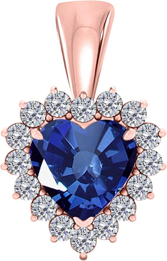 3/4 Carat Heart Shape Created Sapphire Gemstone In Center With 16 Side White Diamond Pendant Necklace For Woman Crafted In 10k Rose White & Yellow Gold With 18" Gold Plated Over 925 Sterling Silver Box Chain