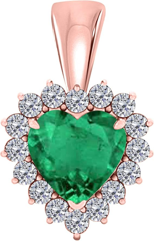 3/4 Carat Heart Shape Created Emerald Gemstone In Center With 16 Side White Diamond Pendant Necklace For Woman Crafted In 10k Rose White & Yellow Gold With 18" Gold Plated Over 925 Sterling Silver Box Chain