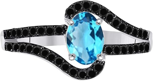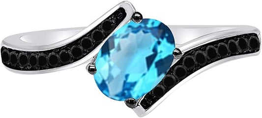 Aonejewelry 1.00 Carat 14K Yellow, White Rose Gold Blue-Topaz And Black Diamond Ring, Best Valentinesday Gift