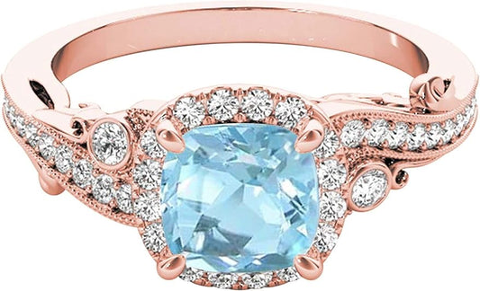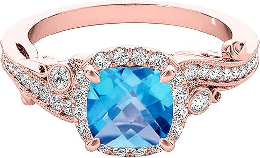 AoneJewelry Blue Topaz Gemstone Engagement Rings for Women |10K Rose, White & Yellow Gold 1.5 Carat Blue Color Cushion Cut Prong Setting Genuine Diamond Wedding Jewelry Collection