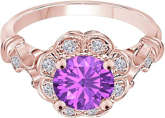1 Carat Round Shape Natural Amethyst Gemstone And Halo Diamond Ring In 10K Solid Rose,White & Yellow Gold, Best Valentinesday Gift