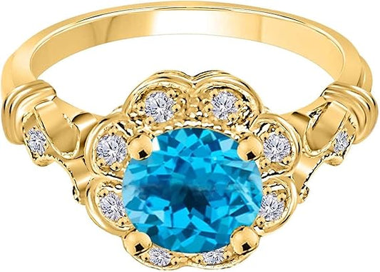 1 Carat Natural Blue-Topaz Gemstone And Halo Diamond Ring In 10K Solid Rose,White & Yellow Gold, Best Valentinesday Gift