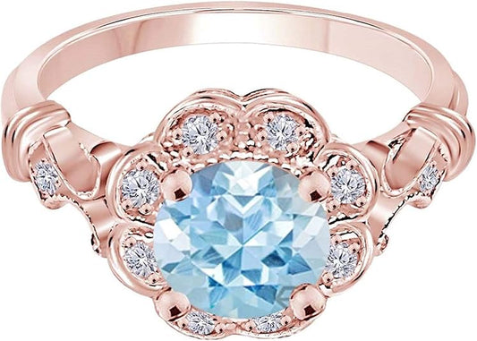 1 Carat Round Shape Natural Aquamarine Gemstone And Halo Diamond Ring In 10K Solid Rose,White & Yellow Gold, Best Valentinesday Gift