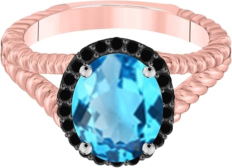 Black Diamond Blue Topaz Ring In 10K Solid Rose, White & Yellow Gold, Best Valentinesday Gift